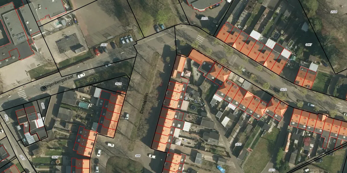Het perceel waarop Emmaplein 33 staat heeft een oppervlakte van 6945 m². Dit is een zeer groot perceel. De perceeloppervlakte wordt geregistreerd door het Kadaster. Gedetailleerde informatie over de maten van dit perceel kunt u vinden in het rapport Kadastrale kaart met maatvoering van Emmaplein 33.
