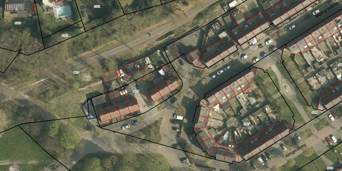 Het perceel waarop Markgravenstraat 82 staat heeft een oppervlakte van 960 m². Dit is een groot perceel. De perceeloppervlakte wordt geregistreerd door het Kadaster. Gedetailleerde informatie over de maten van dit perceel kunt u vinden in het rapport Kadastrale kaart met maatvoering van Markgravenstraat 82.