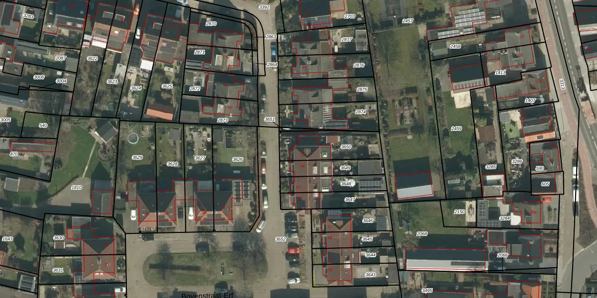 Bovenstraat-Erf 13 is gelegen op kadastraal perceel HVN00D3650. Deze kadastrale aanduiding is uniek en wordt gebruikt door het Kadaster om eigendomsrechten en andere zakelijke rechten vast te leggen. Het perceel maakt onderdeel uit van de kadastrale gemeente Hoeven.