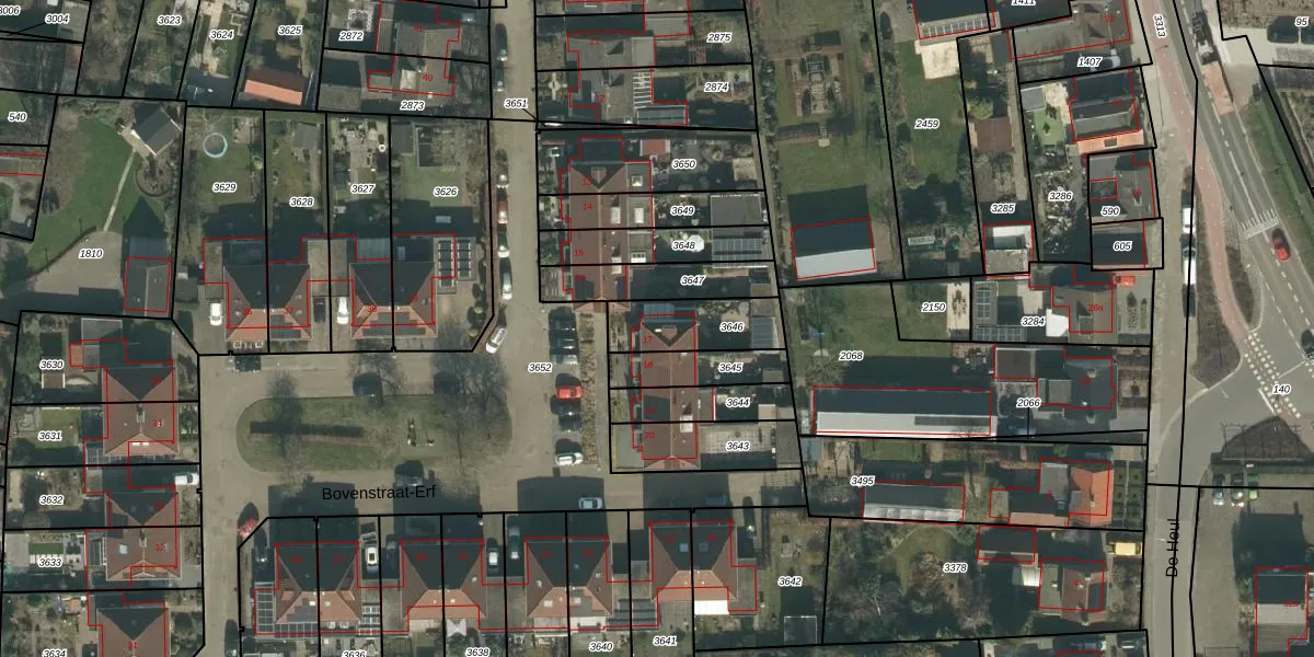 Bovenstraat-Erf 17 is gelegen op kadastraal perceel HVN00D3646. Deze kadastrale aanduiding is uniek en wordt gebruikt door het Kadaster om eigendomsrechten en andere zakelijke rechten vast te leggen. Het perceel maakt onderdeel uit van de kadastrale gemeente Hoeven.