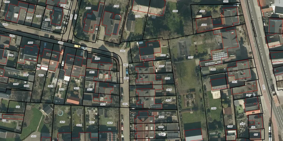 Bovenstraat-Erf 9 is gelegen op kadastraal perceel HVN00D2877. Deze kadastrale aanduiding is uniek en wordt gebruikt door het Kadaster om eigendomsrechten en andere zakelijke rechten vast te leggen. Het perceel maakt onderdeel uit van de kadastrale gemeente Hoeven.