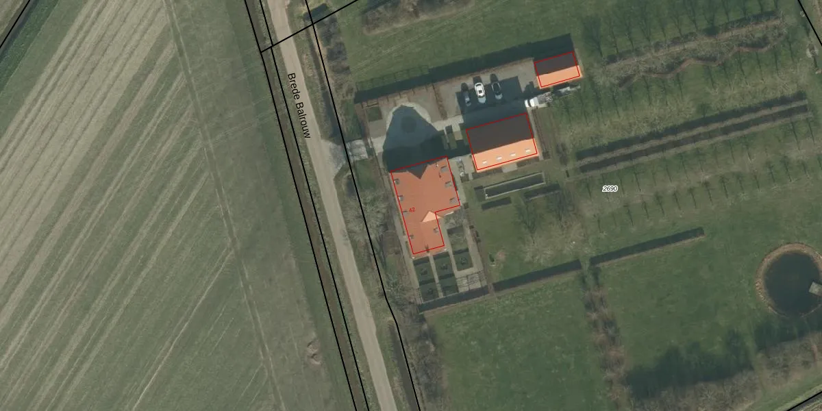 Het perceel waarop Brede Balrouw 42 staat heeft een oppervlakte van 1,7 ha. Dit is een zeer groot perceel. De perceeloppervlakte wordt geregistreerd door het Kadaster. Gedetailleerde informatie over de maten van dit perceel kunt u vinden in het rapport Kadastrale kaart met maatvoering van Brede Balrouw 42.