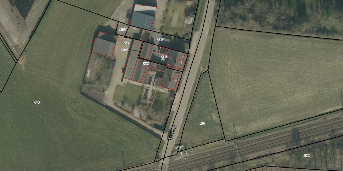 Het perceel waarop De Heul 46 staat heeft een oppervlakte van 1,3 ha. Dit is een zeer groot perceel. De perceeloppervlakte wordt geregistreerd door het Kadaster. Gedetailleerde informatie over de maten van dit perceel kunt u vinden in het rapport Kadastrale kaart met maatvoering van De Heul 46.