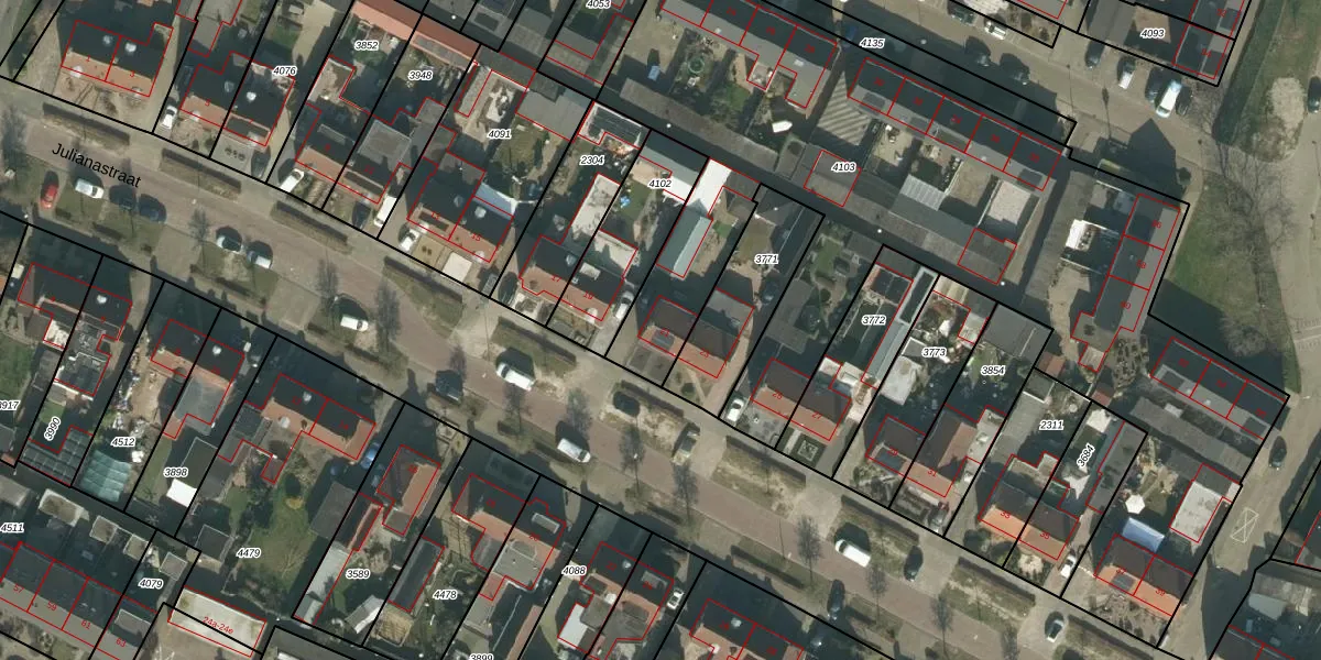 Julianastraat 21 is gelegen op kadastraal perceel HVN00D4103. Deze kadastrale aanduiding is uniek en wordt gebruikt door het Kadaster om eigendomsrechten en andere zakelijke rechten vast te leggen. Het perceel maakt onderdeel uit van de kadastrale gemeente Hoeven.