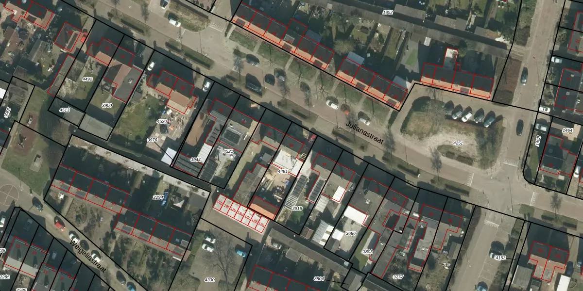 Julianastraat 46 is gelegen op kadastraal perceel HVN00D4481. Deze kadastrale aanduiding is uniek en wordt gebruikt door het Kadaster om eigendomsrechten en andere zakelijke rechten vast te leggen. Het perceel maakt onderdeel uit van de kadastrale gemeente Hoeven.