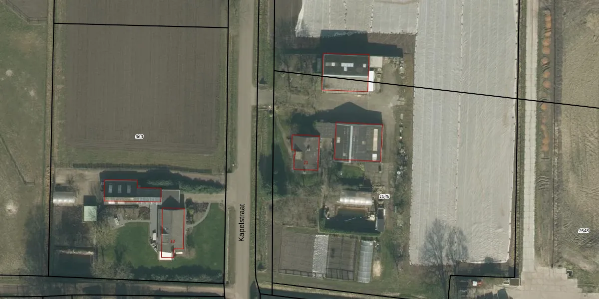 Kapelstraat 21 is gelegen op kadastraal perceel HVN00H1549. Deze kadastrale aanduiding is uniek en wordt gebruikt door het Kadaster om eigendomsrechten en andere zakelijke rechten vast te leggen. Het perceel maakt onderdeel uit van de kadastrale gemeente Hoeven.