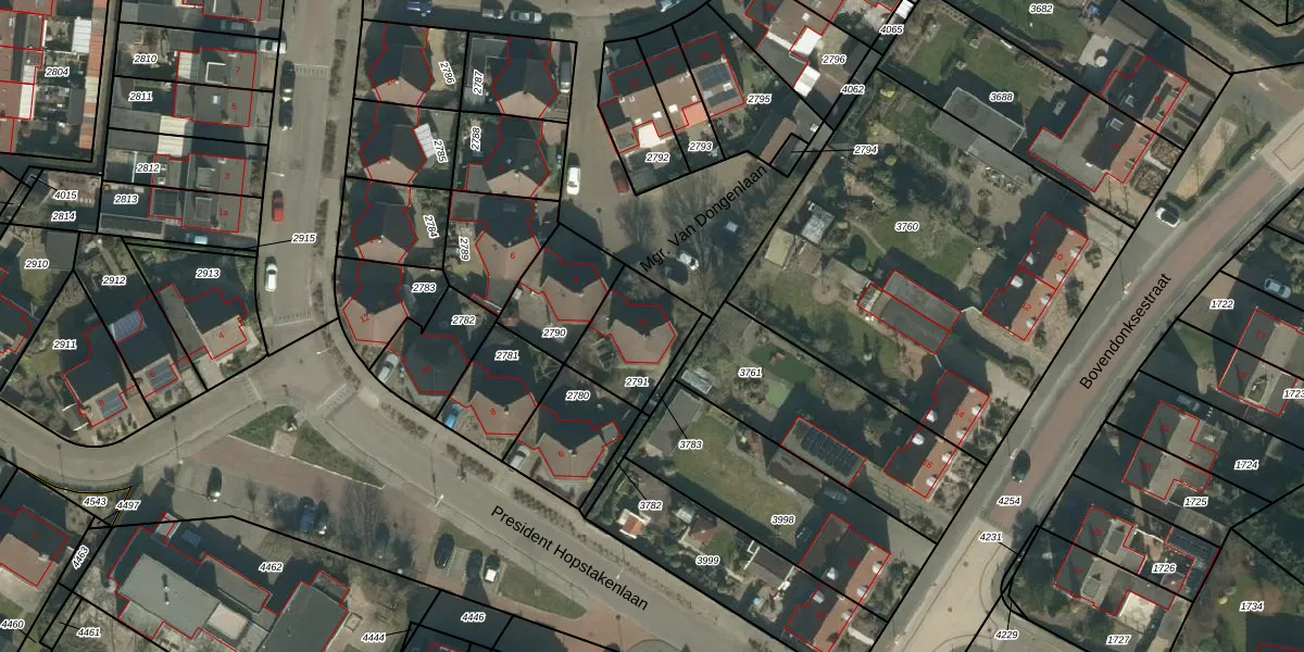 Mgr. Van Dongenlaan 10 is gelegen op kadastraal perceel HVN00D2791. Deze kadastrale aanduiding is uniek en wordt gebruikt door het Kadaster om eigendomsrechten en andere zakelijke rechten vast te leggen. Het perceel maakt onderdeel uit van de kadastrale gemeente Hoeven.