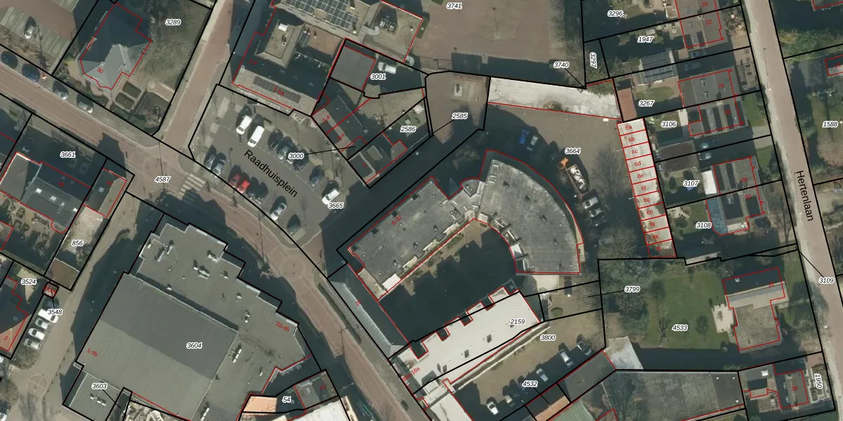 Het perceel waarop Raadhuisplein 26 staat heeft een oppervlakte van 3060 m². Dit is een zeer groot perceel. De perceeloppervlakte wordt geregistreerd door het Kadaster. Gedetailleerde informatie over de maten van dit perceel kunt u vinden in het rapport Kadastrale kaart met maatvoering van Raadhuisplein 26.