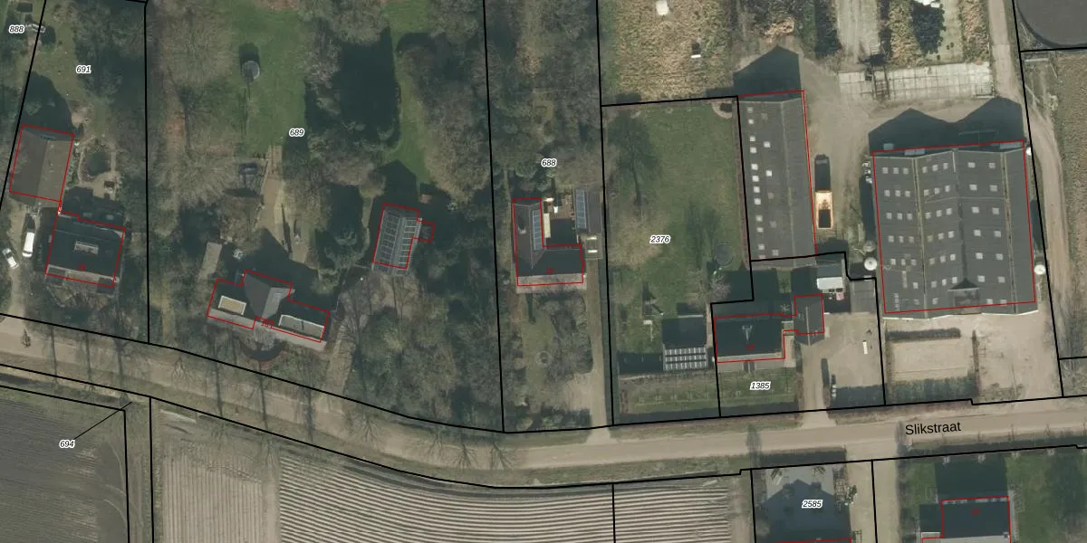 Het perceel waarop Slikstraat 16 staat heeft een oppervlakte van 2140 m². Dit is een zeer groot perceel. De perceeloppervlakte wordt geregistreerd door het Kadaster. Gedetailleerde informatie over de maten van dit perceel kunt u vinden in het rapport Kadastrale kaart met maatvoering van Slikstraat 16.