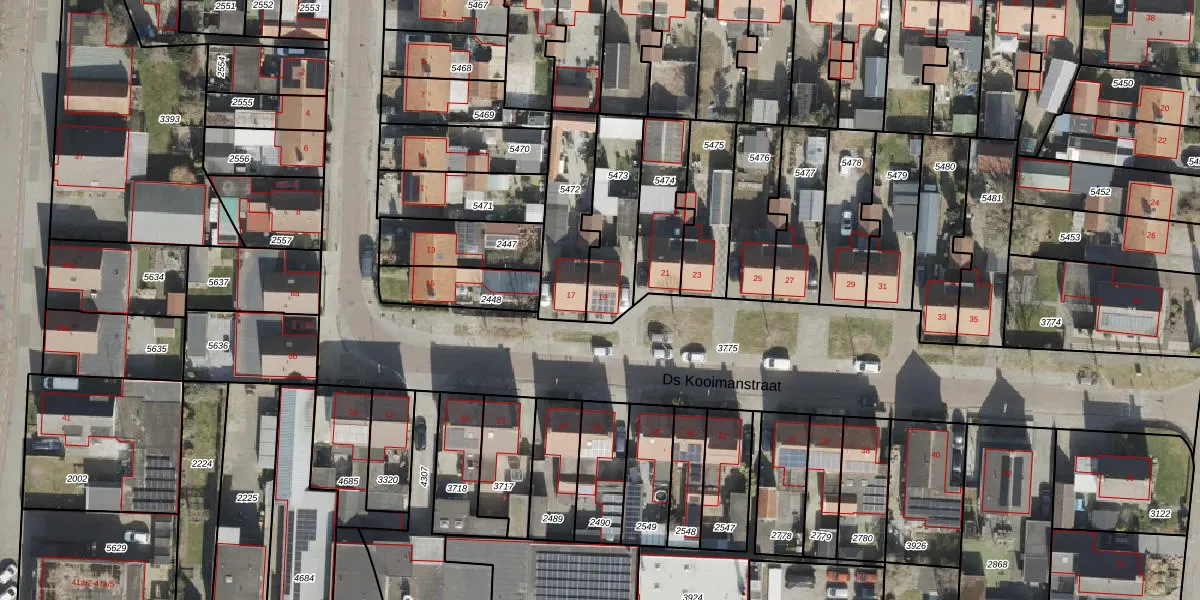 Ds Kooimanstraat 19 is gelegen op kadastraal perceel HGV00K5473. Deze kadastrale aanduiding is uniek en wordt gebruikt door het Kadaster om eigendomsrechten en andere zakelijke rechten vast te leggen. Het perceel maakt onderdeel uit van de kadastrale gemeente Hoogeveen.