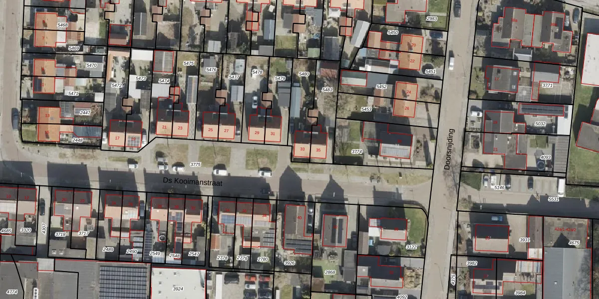 Ds Kooimanstraat 33 is gelegen op kadastraal perceel HGV00K5480. Deze kadastrale aanduiding is uniek en wordt gebruikt door het Kadaster om eigendomsrechten en andere zakelijke rechten vast te leggen. Het perceel maakt onderdeel uit van de kadastrale gemeente Hoogeveen.