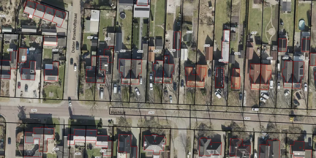Het perceel waarop Rechtuit 19 staat heeft een oppervlakte van 710 m². Dit is een groot perceel. De perceeloppervlakte wordt geregistreerd door het Kadaster. Gedetailleerde informatie over de maten van dit perceel kunt u vinden in het rapport Kadastrale kaart met maatvoering van Rechtuit 19.