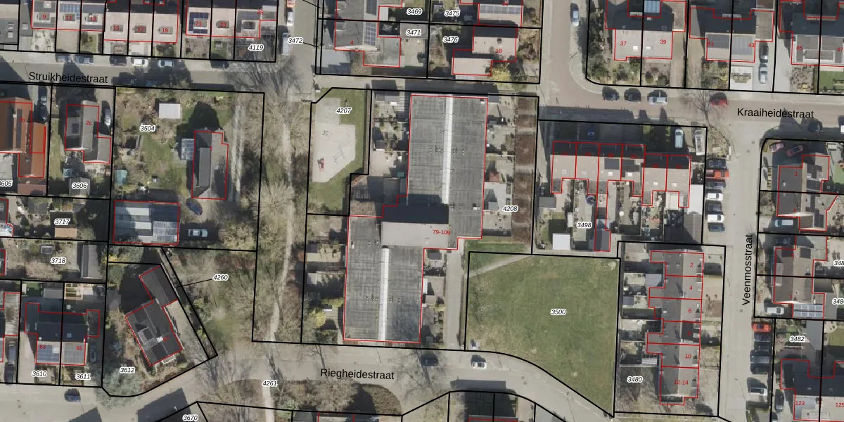 Het perceel waarop Riegheidestraat 95 staat heeft een oppervlakte van 2537 m². Dit is een zeer groot perceel. De perceeloppervlakte wordt geregistreerd door het Kadaster. Gedetailleerde informatie over de maten van dit perceel kunt u vinden in het rapport Kadastrale kaart met maatvoering van Riegheidestraat 95.