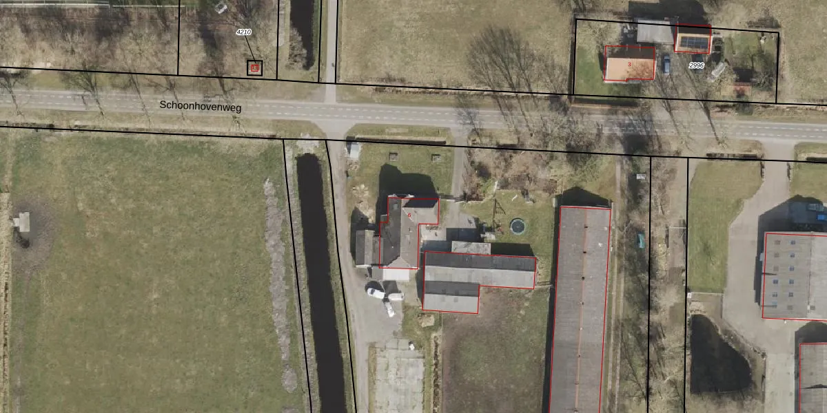 Het perceel waarop Schoonhovenweg 6 staat heeft een oppervlakte van 3,2 ha. Dit is een zeer groot perceel. De perceeloppervlakte wordt geregistreerd door het Kadaster. Gedetailleerde informatie over de maten van dit perceel kunt u vinden in het rapport Kadastrale kaart met maatvoering van Schoonhovenweg 6.