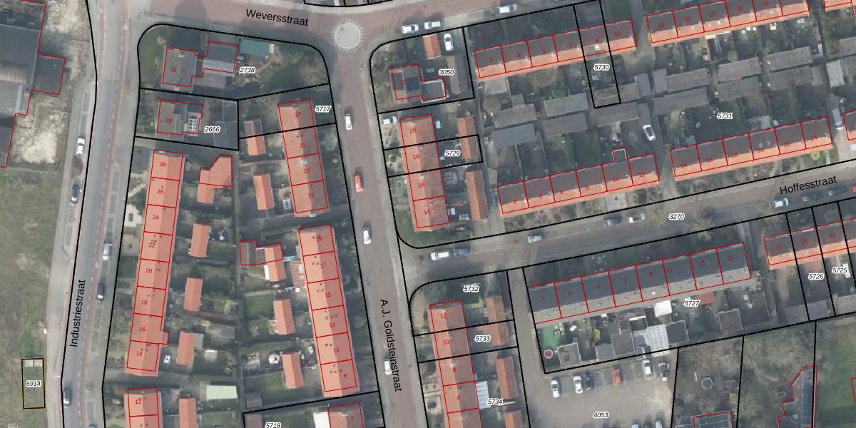 Het perceel waarop A.J. Goldsteinstraat 14 staat heeft een oppervlakte van 6370 m². Dit is een zeer groot perceel. De perceeloppervlakte wordt geregistreerd door het Kadaster. Gedetailleerde informatie over de maten van dit perceel kunt u vinden in het rapport Kadastrale kaart met maatvoering van A.J. Goldsteinstraat 14.