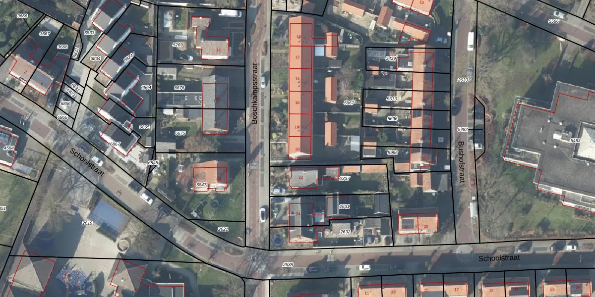 Het perceel waarop Boschkampsstraat 20 staat heeft een oppervlakte van 3422 m². Dit is een zeer groot perceel. De perceeloppervlakte wordt geregistreerd door het Kadaster. Gedetailleerde informatie over de maten van dit perceel kunt u vinden in het rapport Kadastrale kaart met maatvoering van Boschkampsstraat 20.