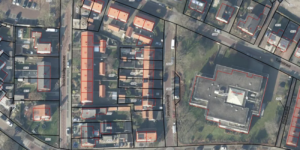 Het perceel waarop Bushofstraat 3 staat heeft een oppervlakte van 183 m². Dit is een middelgroot perceel. De perceeloppervlakte wordt geregistreerd door het Kadaster. Gedetailleerde informatie over de maten van dit perceel kunt u vinden in het rapport Kadastrale kaart met maatvoering van Bushofstraat 3.