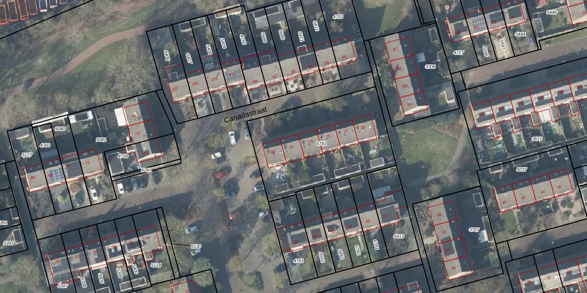 Het perceel waarop Canadastraat 71 staat heeft een oppervlakte van 1279 m². Dit is een zeer groot perceel. De perceeloppervlakte wordt geregistreerd door het Kadaster. Gedetailleerde informatie over de maten van dit perceel kunt u vinden in het rapport Kadastrale kaart met maatvoering van Canadastraat 71.