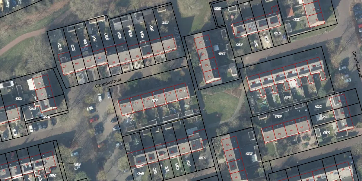 Het perceel waarop Canadastraat 79 staat heeft een oppervlakte van 1279 m². Dit is een zeer groot perceel. De perceeloppervlakte wordt geregistreerd door het Kadaster. Gedetailleerde informatie over de maten van dit perceel kunt u vinden in het rapport Kadastrale kaart met maatvoering van Canadastraat 79.