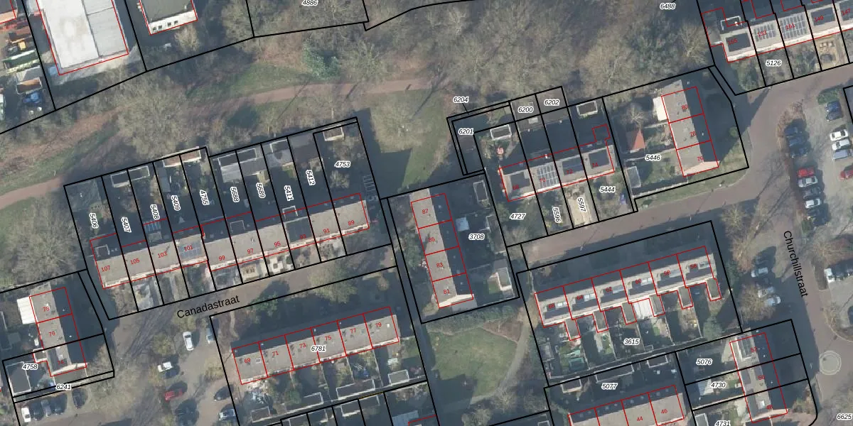 Het perceel waarop Canadastraat 87 staat heeft een oppervlakte van 735 m². Dit is een groot perceel. De perceeloppervlakte wordt geregistreerd door het Kadaster. Gedetailleerde informatie over de maten van dit perceel kunt u vinden in het rapport Kadastrale kaart met maatvoering van Canadastraat 87.