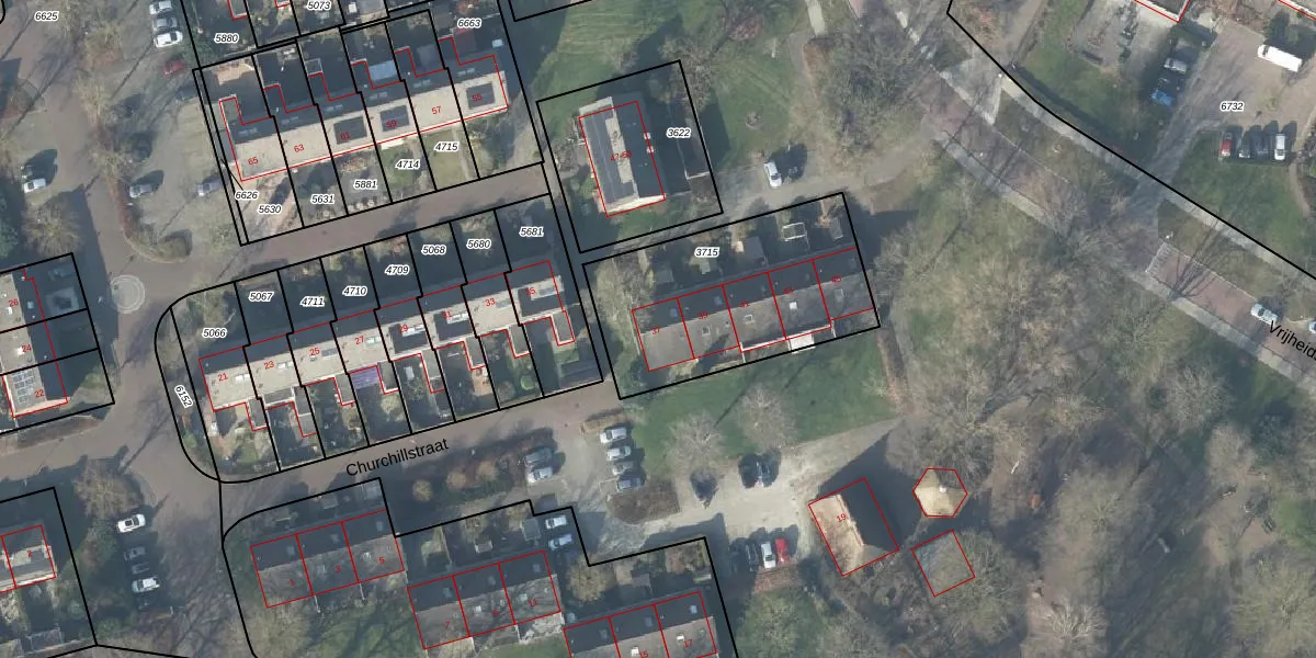 Het perceel waarop Churchillstraat 37 staat heeft een oppervlakte van 869 m². Dit is een groot perceel. De perceeloppervlakte wordt geregistreerd door het Kadaster. Gedetailleerde informatie over de maten van dit perceel kunt u vinden in het rapport Kadastrale kaart met maatvoering van Churchillstraat 37.