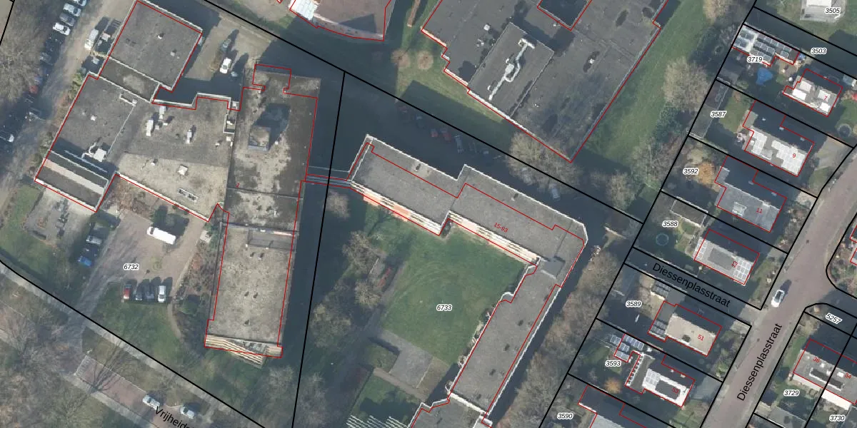 Het perceel waarop Diessenplasstraat 45 staat heeft een oppervlakte van 5380 m². Dit is een zeer groot perceel. De perceeloppervlakte wordt geregistreerd door het Kadaster. Gedetailleerde informatie over de maten van dit perceel kunt u vinden in het rapport Kadastrale kaart met maatvoering van Diessenplasstraat 45.