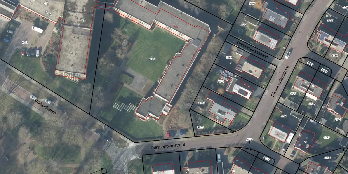 Het perceel waarop Diessenplasstraat 63 staat heeft een oppervlakte van 5380 m². Dit is een zeer groot perceel. De perceeloppervlakte wordt geregistreerd door het Kadaster. Gedetailleerde informatie over de maten van dit perceel kunt u vinden in het rapport Kadastrale kaart met maatvoering van Diessenplasstraat 63.