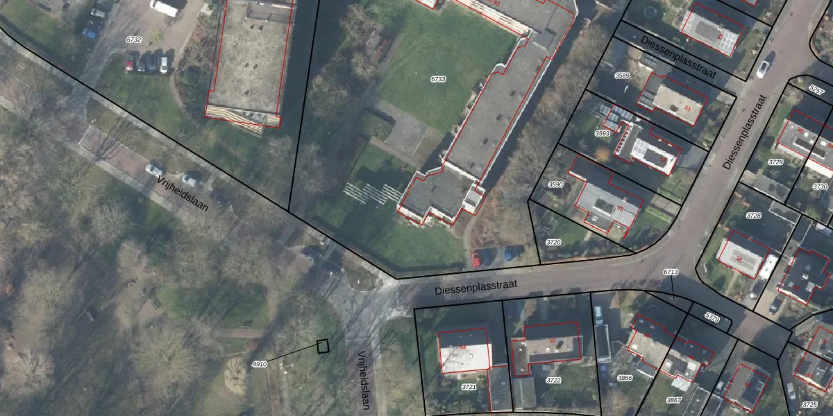 Het perceel waarop Diessenplasstraat 69 staat heeft een oppervlakte van 5380 m². Dit is een zeer groot perceel. De perceeloppervlakte wordt geregistreerd door het Kadaster. Gedetailleerde informatie over de maten van dit perceel kunt u vinden in het rapport Kadastrale kaart met maatvoering van Diessenplasstraat 69.