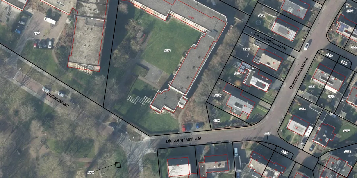 Het perceel waarop Diessenplasstraat 79 staat heeft een oppervlakte van 5380 m². Dit is een zeer groot perceel. De perceeloppervlakte wordt geregistreerd door het Kadaster. Gedetailleerde informatie over de maten van dit perceel kunt u vinden in het rapport Kadastrale kaart met maatvoering van Diessenplasstraat 79.