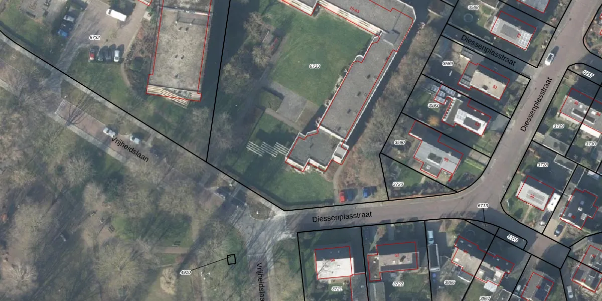 Het perceel waarop Diessenplasstraat 83 staat heeft een oppervlakte van 5380 m². Dit is een zeer groot perceel. De perceeloppervlakte wordt geregistreerd door het Kadaster. Gedetailleerde informatie over de maten van dit perceel kunt u vinden in het rapport Kadastrale kaart met maatvoering van Diessenplasstraat 83.