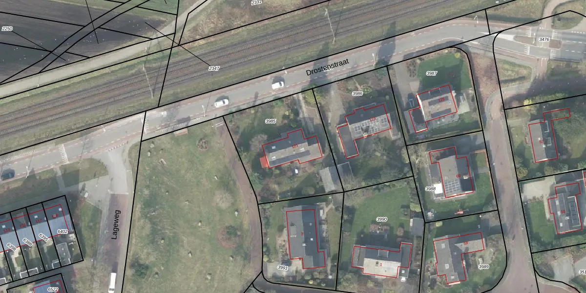 Drostenstraat 121 is gelegen op kadastraal perceel HTN03F3985. Deze kadastrale aanduiding is uniek en wordt gebruikt door het Kadaster om eigendomsrechten en andere zakelijke rechten vast te leggen. Het perceel maakt onderdeel uit van de kadastrale gemeente Holten.