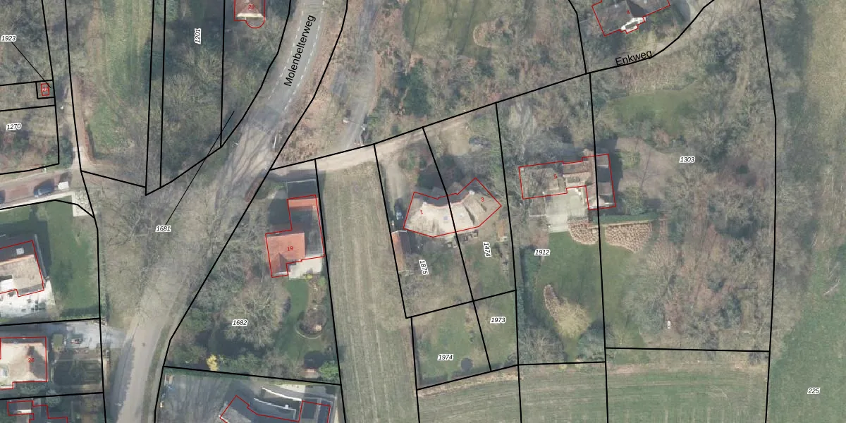 Enkweg 1 is gelegen op kadastraal perceel HTN03A1875. Deze kadastrale aanduiding is uniek en wordt gebruikt door het Kadaster om eigendomsrechten en andere zakelijke rechten vast te leggen. Het perceel maakt onderdeel uit van de kadastrale gemeente Holten.