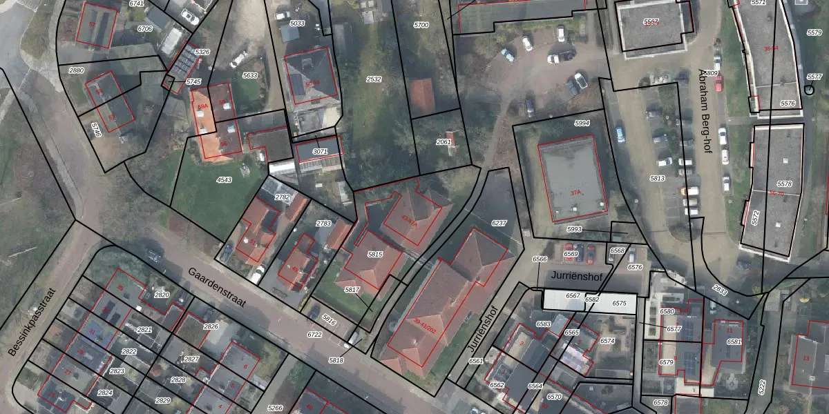 Het perceel waarop Gaardenstraat 45 staat heeft een oppervlakte van 715 m². Dit is een groot perceel. De perceeloppervlakte wordt geregistreerd door het Kadaster. Gedetailleerde informatie over de maten van dit perceel kunt u vinden in het rapport Kadastrale kaart met maatvoering van Gaardenstraat 45.