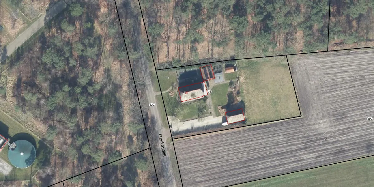 Het perceel waarop Geskesdijk 20 staat heeft een oppervlakte van 2530 m². Dit is een zeer groot perceel. De perceeloppervlakte wordt geregistreerd door het Kadaster. Gedetailleerde informatie over de maten van dit perceel kunt u vinden in het rapport Kadastrale kaart met maatvoering van Geskesdijk 20.