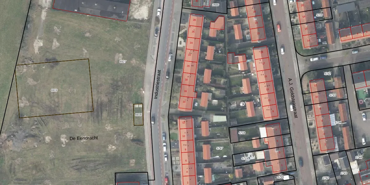 Het perceel waarop Industriestraat 16 staat heeft een oppervlakte van 5817 m². Dit is een zeer groot perceel. De perceeloppervlakte wordt geregistreerd door het Kadaster. Gedetailleerde informatie over de maten van dit perceel kunt u vinden in het rapport Kadastrale kaart met maatvoering van Industriestraat 16.