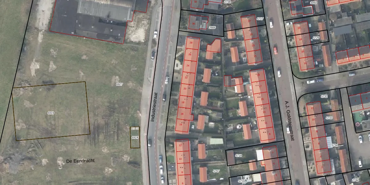 Het perceel waarop Industriestraat 20 staat heeft een oppervlakte van 5817 m². Dit is een zeer groot perceel. De perceeloppervlakte wordt geregistreerd door het Kadaster. Gedetailleerde informatie over de maten van dit perceel kunt u vinden in het rapport Kadastrale kaart met maatvoering van Industriestraat 20.
