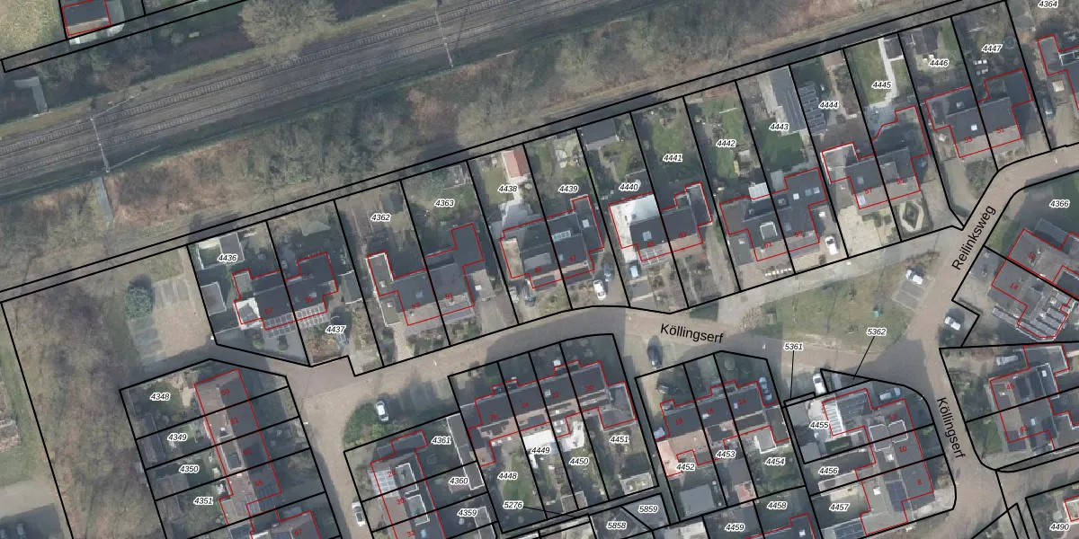 Het perceel waarop Köllingserf 49 staat heeft een oppervlakte van 340 m². Dit is een groot perceel. De perceeloppervlakte wordt geregistreerd door het Kadaster. Gedetailleerde informatie over de maten van dit perceel kunt u vinden in het rapport Kadastrale kaart met maatvoering van Köllingserf 49.