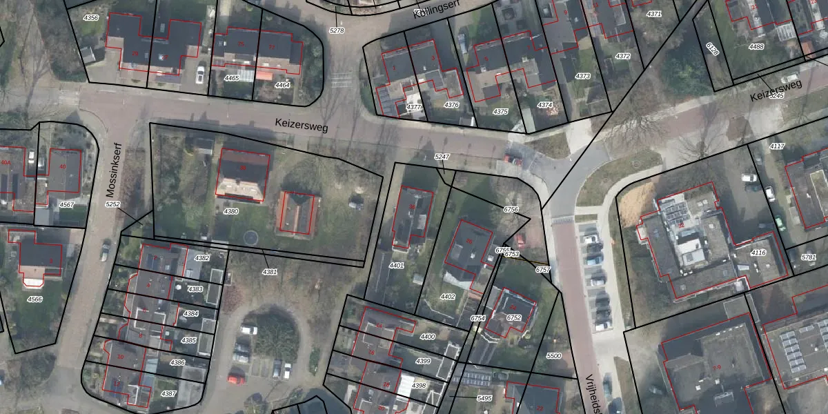 Het perceel waarop Keizersweg 36 staat heeft een oppervlakte van 466 m². Dit is een groot perceel. De perceeloppervlakte wordt geregistreerd door het Kadaster. Gedetailleerde informatie over de maten van dit perceel kunt u vinden in het rapport Kadastrale kaart met maatvoering van Keizersweg 36.
