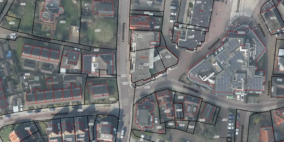 Larenseweg 10-15 is gelegen op kadastraal perceel HTN03F4901. Deze kadastrale aanduiding is uniek en wordt gebruikt door het Kadaster om eigendomsrechten en andere zakelijke rechten vast te leggen. Het perceel maakt onderdeel uit van de kadastrale gemeente Holten.