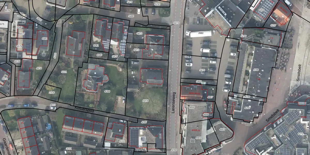 Larenseweg 17 is gelegen op kadastraal perceel HTN03F5474. Deze kadastrale aanduiding is uniek en wordt gebruikt door het Kadaster om eigendomsrechten en andere zakelijke rechten vast te leggen. Het perceel maakt onderdeel uit van de kadastrale gemeente Holten.