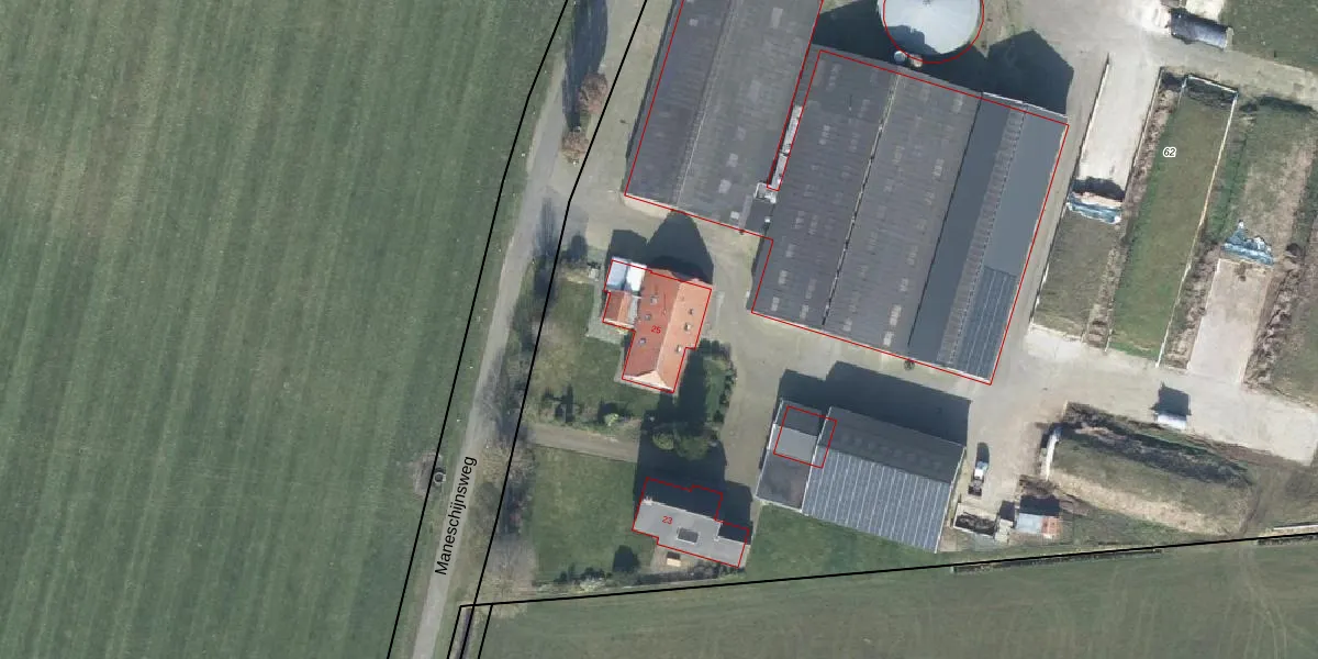 Het perceel waarop Maneschijnsweg 25 staat heeft een oppervlakte van 2,0 ha. Dit is een zeer groot perceel. De perceeloppervlakte wordt geregistreerd door het Kadaster. Gedetailleerde informatie over de maten van dit perceel kunt u vinden in het rapport Kadastrale kaart met maatvoering van Maneschijnsweg 25.