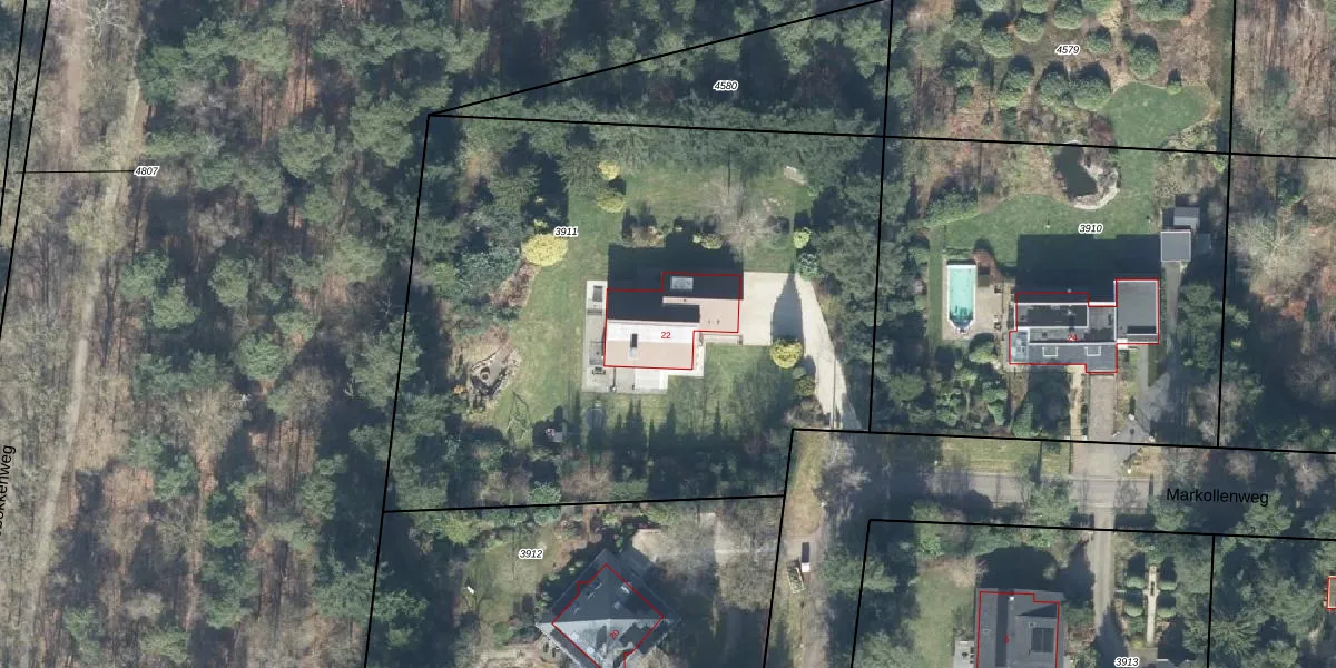 Het perceel waarop Markollenweg 22 staat heeft een oppervlakte van 3860 m². Dit is een zeer groot perceel. De perceeloppervlakte wordt geregistreerd door het Kadaster. Gedetailleerde informatie over de maten van dit perceel kunt u vinden in het rapport Kadastrale kaart met maatvoering van Markollenweg 22.