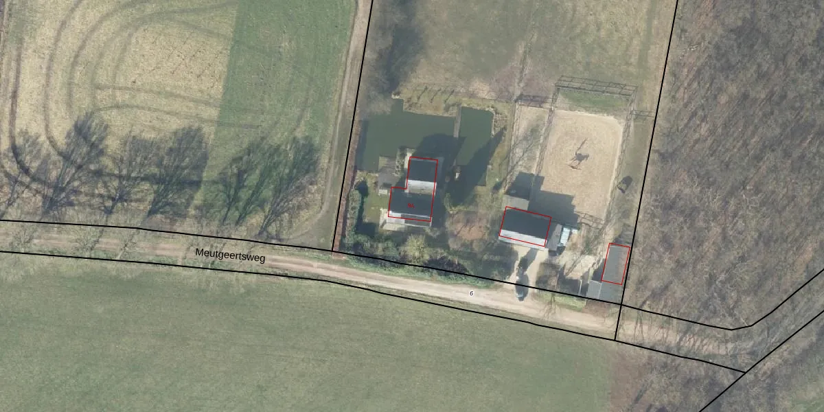 Het perceel waarop Meutgeertsweg 9-A staat heeft een oppervlakte van 1,0 ha. Dit is een zeer groot perceel. De perceeloppervlakte wordt geregistreerd door het Kadaster. Gedetailleerde informatie over de maten van dit perceel kunt u vinden in het rapport Kadastrale kaart met maatvoering van Meutgeertsweg 9-A.