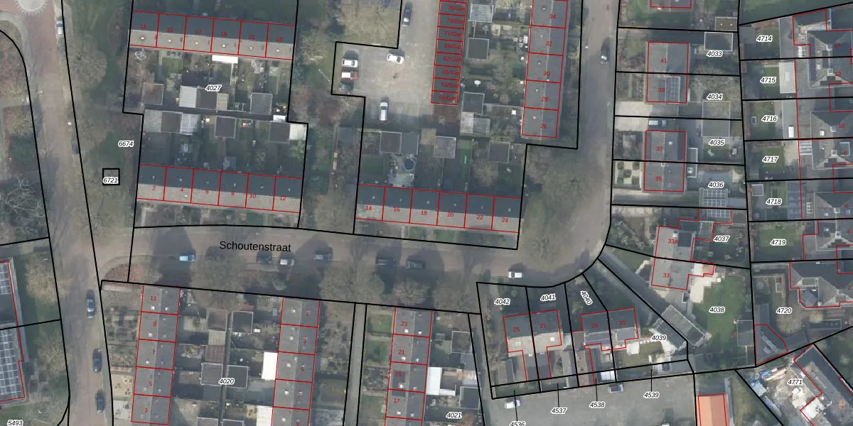 Het perceel waarop Schoutenstraat 18 staat heeft een oppervlakte van 8980 m². Dit is een zeer groot perceel. De perceeloppervlakte wordt geregistreerd door het Kadaster. Gedetailleerde informatie over de maten van dit perceel kunt u vinden in het rapport Kadastrale kaart met maatvoering van Schoutenstraat 18.