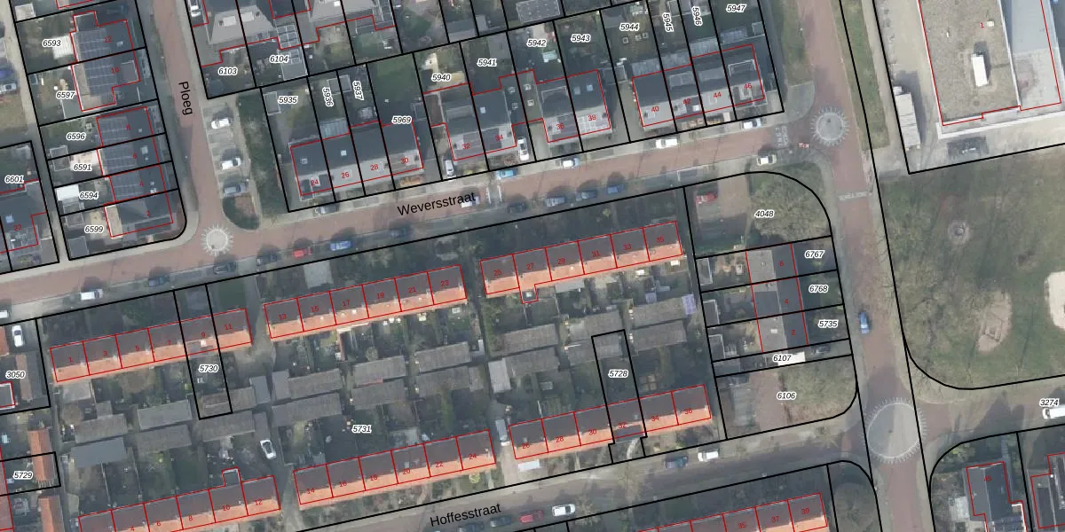 Het perceel waarop Weversstraat 27 staat heeft een oppervlakte van 6370 m². Dit is een zeer groot perceel. De perceeloppervlakte wordt geregistreerd door het Kadaster. Gedetailleerde informatie over de maten van dit perceel kunt u vinden in het rapport Kadastrale kaart met maatvoering van Weversstraat 27.