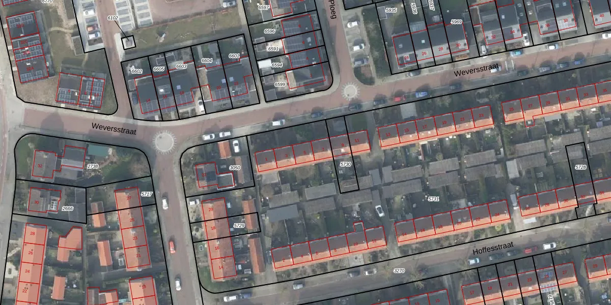 Het perceel waarop Weversstraat 5 staat heeft een oppervlakte van 6370 m². Dit is een zeer groot perceel. De perceeloppervlakte wordt geregistreerd door het Kadaster. Gedetailleerde informatie over de maten van dit perceel kunt u vinden in het rapport Kadastrale kaart met maatvoering van Weversstraat 5.