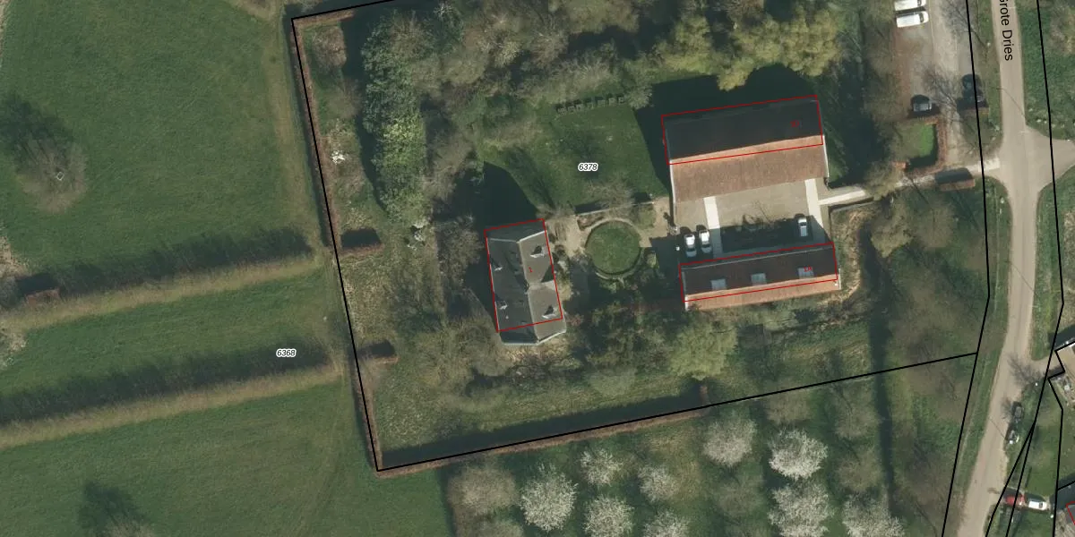Het perceel waarop Grote Dries 1 staat heeft een oppervlakte van 1,0 ha. Dit is een zeer groot perceel. De perceeloppervlakte wordt geregistreerd door het Kadaster. Gedetailleerde informatie over de maten van dit perceel kunt u vinden in het rapport Kadastrale kaart met maatvoering van Grote Dries 1.