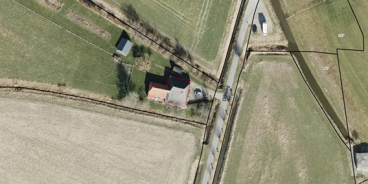 Het perceel waarop Dijkweg 19 staat heeft een oppervlakte van 8400 m². Dit is een zeer groot perceel. De perceeloppervlakte wordt geregistreerd door het Kadaster. Gedetailleerde informatie over de maten van dit perceel kunt u vinden in het rapport Kadastrale kaart met maatvoering van Dijkweg 19.