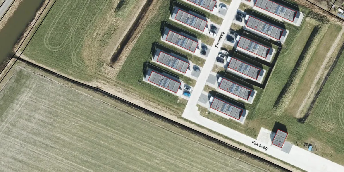 Het perceel waarop Fivelweg 1 staat heeft een oppervlakte van 3,3 ha. Dit is een zeer groot perceel. De perceeloppervlakte wordt geregistreerd door het Kadaster. Gedetailleerde informatie over de maten van dit perceel kunt u vinden in het rapport Kadastrale kaart met maatvoering van Fivelweg 1.