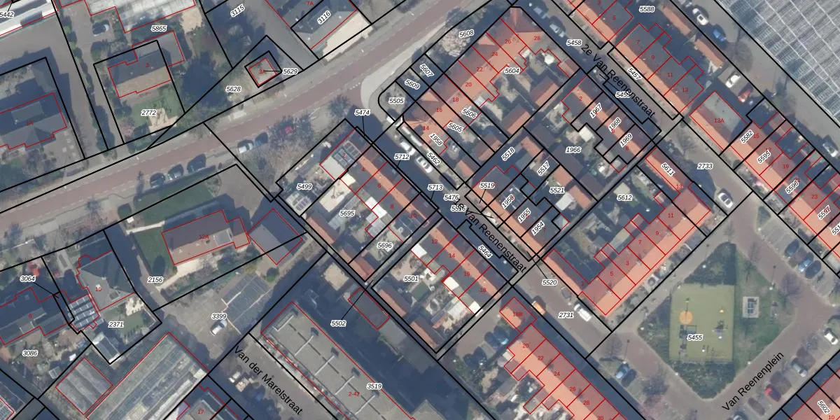 1e Van Reenenstraat 10 is gelegen op kadastraal perceel NWK01A5696. Deze kadastrale aanduiding is uniek en wordt gebruikt door het Kadaster om eigendomsrechten en andere zakelijke rechten vast te leggen. Het perceel maakt onderdeel uit van de kadastrale gemeente Naaldwijk.